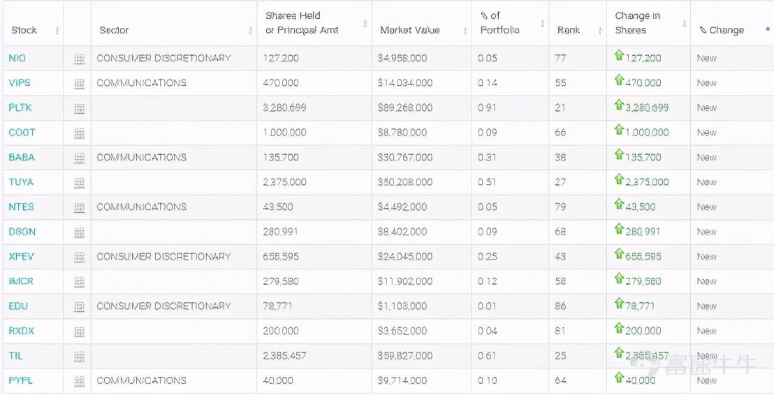 在高位清仓新能源汽车和阿里巴巴后,高瓴资本本季度重新买入了蔚来、小鹏和阿里,京东、哔哩哔哩等涨幅巨大的中概股也被相应减持,好未来和一起教育则被清仓卖出。