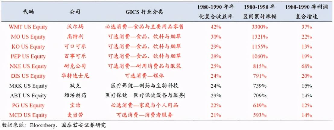 80-90年代美国消费升级的黄金时代,大市值公司收益率前十的公司中有8个消费股,2个为医药股。