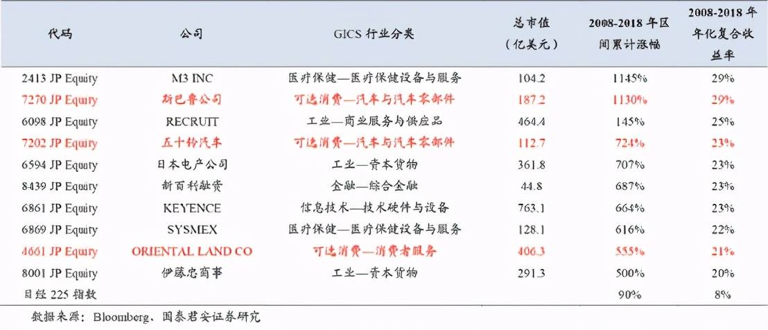 即使是在日本经济萎靡不振失去的二十年中,指数几乎不涨,但消费行业频出牛股。日本2008-2018年年化复合收益率排名前十的公司中有3个消费股,2个医药股。
