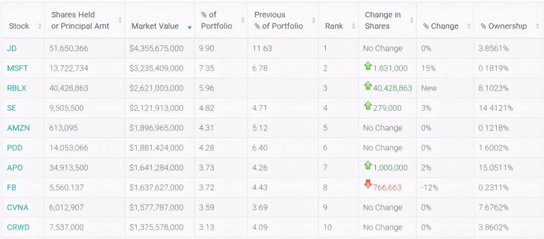 本季度老虎环球最大持仓个股为京东,持仓占比达11.63%,位列第一重仓股,微软为第二重仓股,在前十大持仓中,拼多多、亚马逊维持仓位不变。