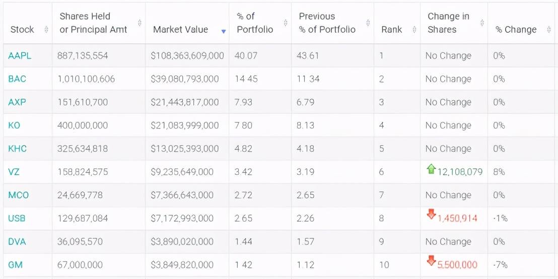 股神巴菲特旗下的伯克希尔公布了最新持仓,本季度伯克希尔持仓中,前十大重仓股变动较少,前五大重仓股更是不增不减。其中,苹果、美国银行、美国运通、可口可乐、卡夫亨氏位列前5大重仓股,苹果公司更是以40%持仓占比雄居第一大重仓股,受苹果持仓占比高的影响,伯克希尔公司前十大持仓占比达86%。