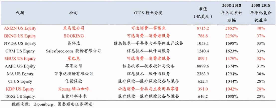 美国2008-2018年年化复合收益率排名前十中,消费股占了4个,医药股占了2个。
