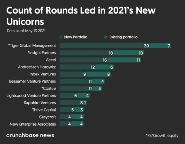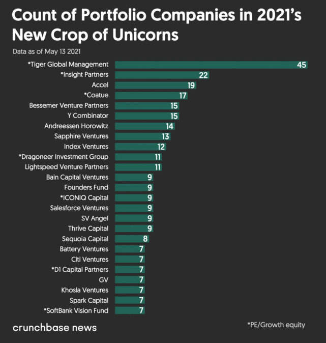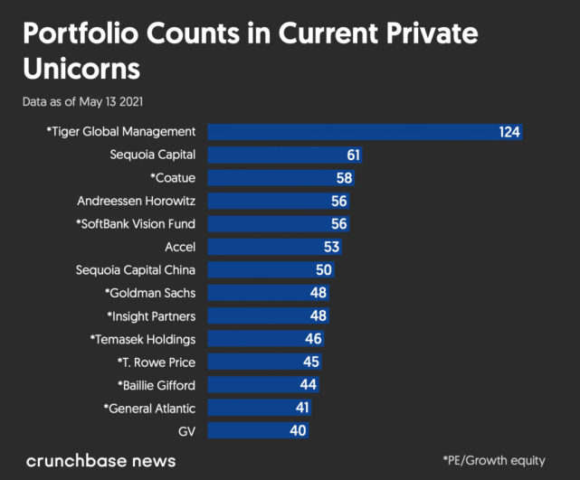根据Crunchbase的分析,总部位于纽约的私募股权公司老虎环球(Tiger Global Management)是2021年新晋独角兽以及整体私人独角兽初创企业中最活跃的投资者--该公司不仅是人们可以预期的投资组合最多的公司,也是投资数量最多的公司。