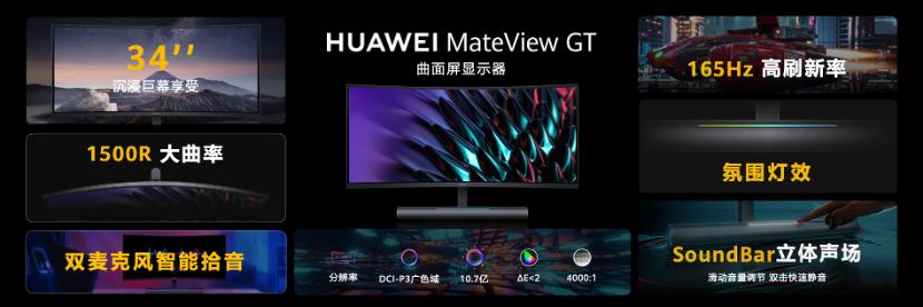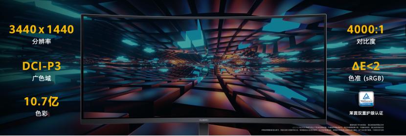 与华为MateView不同,华为MateView GT则是一款曲面沉浸式显示器,面向追求高效办公的商务人士,追求沉浸视听体验的影音爱好者,以及追求酷炫的电竞玩家。其配备一块34英寸WQHD分辨率窄边大屏,采用21:9比例,拥有1500R大曲率,能够带来更沉浸的视觉体验;90% DCI-P3广色域,10.7亿色丰富色彩显示,逐台校准的△E<2极致色准,HDR10高动态范围,以及莱茵认证,让它拥有沉浸的显示效果的同时,也对眼睛更加呵护。