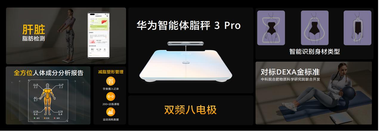 华为智能体脂秤3 Pro,采用双频八电极技术,更精准检测身体不同躯段数据;华为智能体脂秤3 Pro是华为首款支持肝脏脂肪检测的体脂秤,树兰医疗感染科医生集团基于这款产品开展的肝脏脂肪研究项目,让用户居家即可进行肝脏健康管理;同时拥有一键输出人体成分分析报告、智能识别身材、减脂塑形管理等功能,为塑造理想身形提供科学依据和指导。