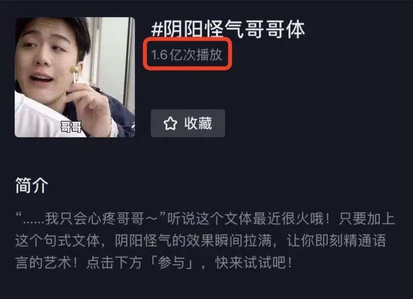 在抖音,以模仿“心疼哥哥”为主要内容的tag#阴阳怪气哥哥体#,播放量1.6亿次。