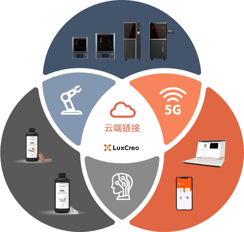3D打印的核心分为三部分:硬件、软件、材料。清锋科技在3D打印最核心的材料体系方面,EM弹性材料和TM韧性材料体系性能不断提升,并陆续开发了Dental系列齿科树脂、RE系列快速打印树脂、HT耐高温树脂等多品类3D打印材料。LuxFlow、LuxLink、LuxScan、LuxAlign等打印配套软件也悉数到位。在硬件方面,除了基于DLP的LEAP®技术,清锋科技还独创了高性能LCD技术,结合两种技术推出Lux 3+系列工业级打印机和iLux系列桌面级打印机,不断升级打印机设备类型,丰富打印机应用场景。综合以上三个方面创新成果,清锋科技集成了面向多个应用领域的行业解决方案,可以快速按需部署,并针对客户实现定制开发。