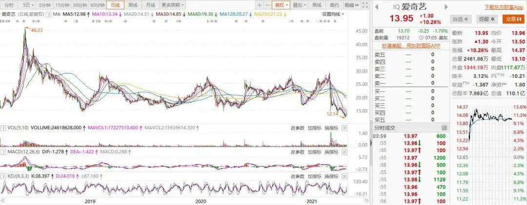 截至5月19日盘前,爱奇艺下跌0.29%,报13.91美元,较2018年6月19日的高点46.23美元,跌幅约七成。