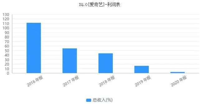 同花顺iFinD数据显示,2016年至2020年,爱奇艺总收入增速分别为111.29%、54.65%、43.79%、16.03%和2.46%。