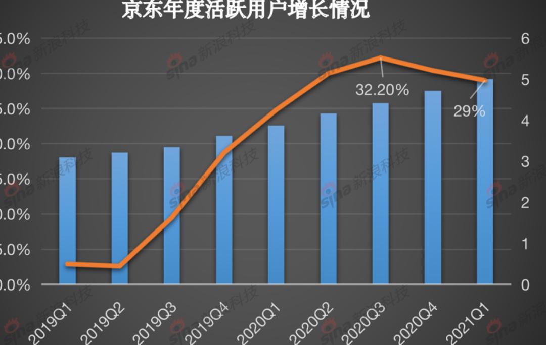 在这份最新的财报中,京东活跃购买用户数已接近5亿,同比2020年第一季度末净增了1.12亿。但是活跃购买用户数的增长速度自2020年第三季度以来,开始有所放缓。