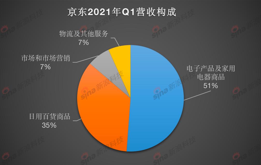 营收构成上,目前京东主要有商品收入和服务收入两大部分组成,其中,电子产品及家用电器商品收入占比最高,为51%,日用百货商品收入占比为35%。这两部分组成的商品收入,较2020年同期增加了34.7%,为近三年同期的最高增幅。