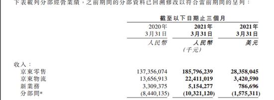 财报显示,截止2021年3月31日,京东零售收入1857.96亿元,同比增长35.27%;物流收入224.11亿元,同比增长64.1%;新业务收入51.54亿元,同比增长55.76%。