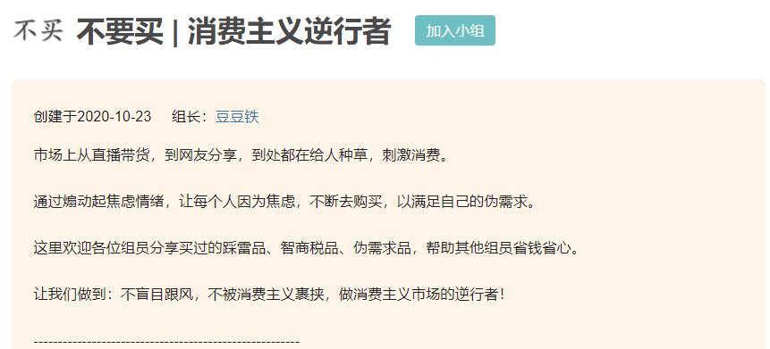 在豆瓣,一个名为“不要买|消费主义逆行者”的小组,短短半年时间就汇聚了21万多豆瓣用户。与直播带货浪潮和各大种草平台催生出的“买买买”形成鲜明对比,他们在这里分享自己的节俭日常,提醒别人注意消费主义陷阱,劝退盲目消费。
