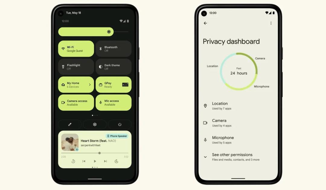 除了个性化,Android 12 也优化了底层性能占用,让整个系统变得更轻快、灵敏。另外,Android 12 延续此前 Android 版本在系统隐私上的所做的努力,新的隐私仪表板(Privacy Dashboard)会以时间线的形式展示应用们调用位置、麦克风、摄像头、剪切板等敏感动作。