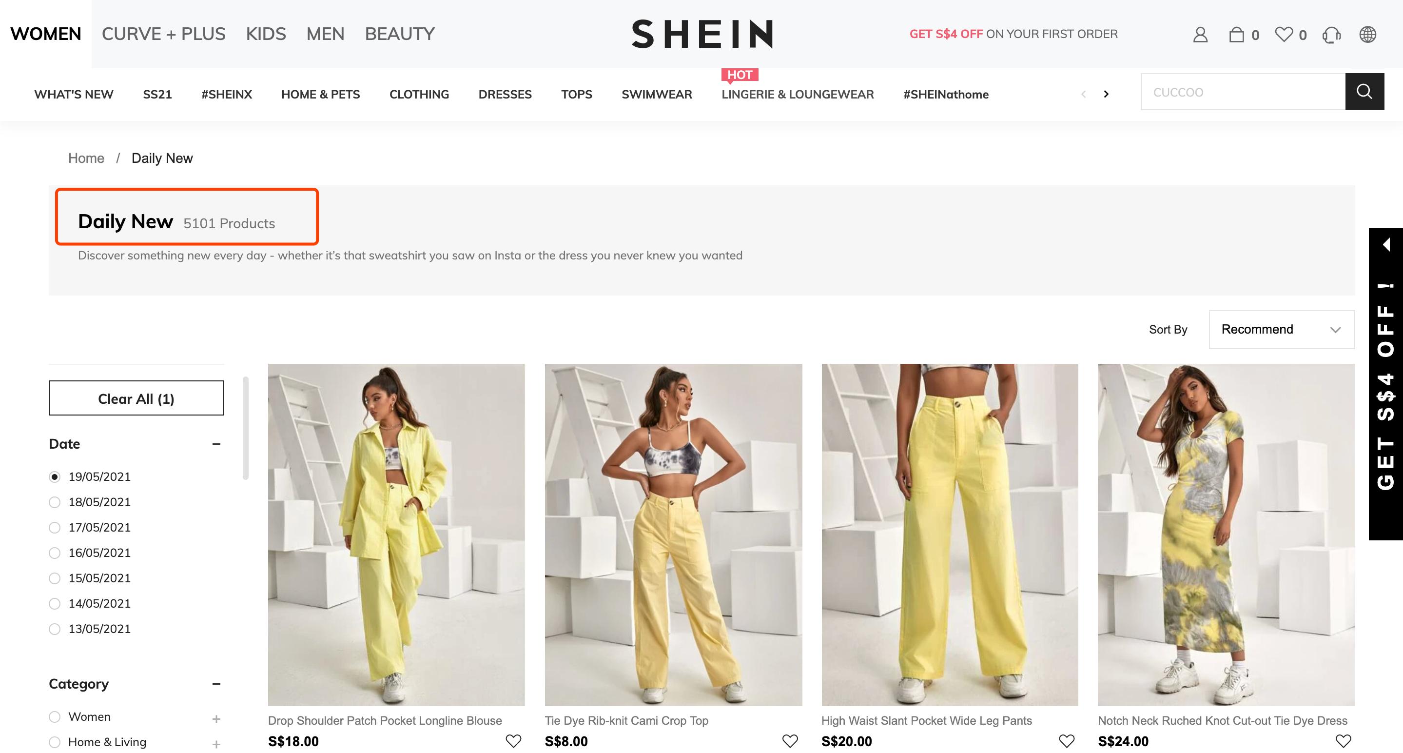 SHEIN 的官网上,上新量以周计,以最近一周举例,SHEIN 的全品类上新量为5101款。