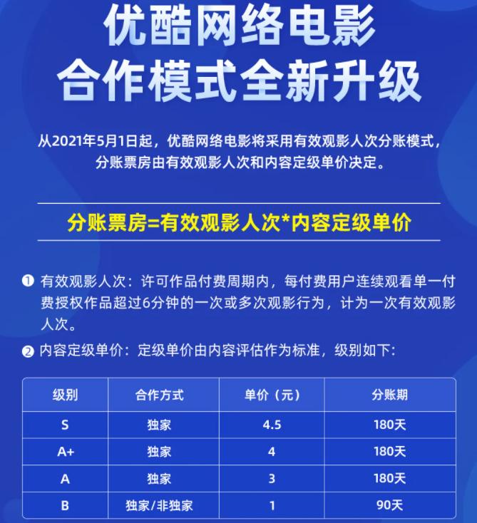 或许是为了缓解这一状况,4月份优酷对网络电影分账规则进行了全面升级,取消了之前“有效观影时长”的衡量维度,采取了跟爱奇艺一样的“有效观影人次”,并且也是以6分钟为限。