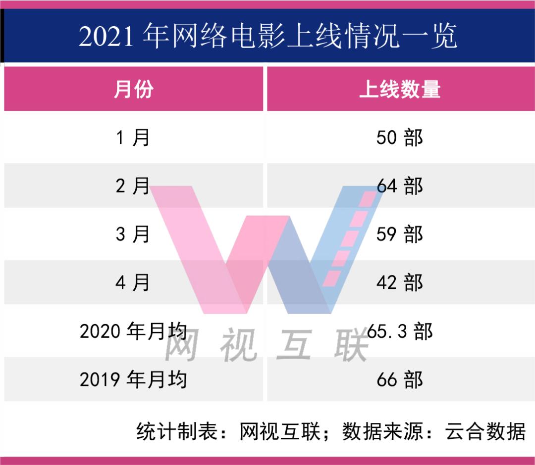 据云合数据,4月份全网上线网络电影共42部,数量上较3月份有所减少,也远远低于2019和2020年的月均上线。