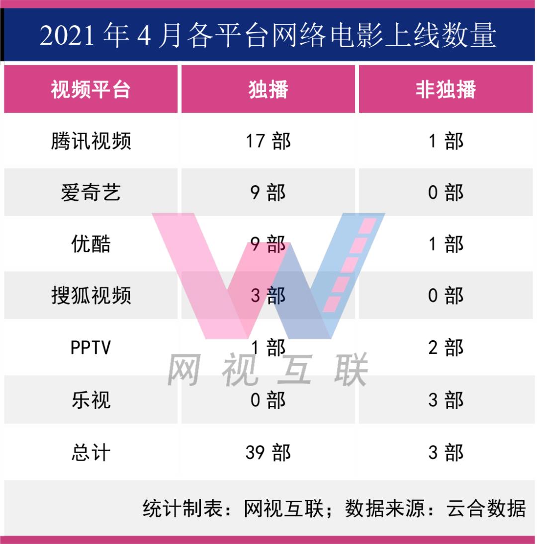 在39部独播影片中,腾讯视频17部,优酷和爱奇艺各9部,搜狐视频3部,PPTV1部。