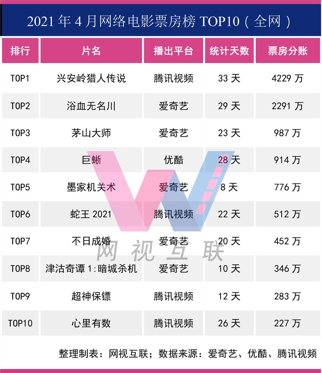 不过取得4月份片冠军的,是腾讯视频独播的《兴安岭猎人传说》。《兴安岭猎人传说》首月分账4173万,刷新行业纪录。上线33天,票房分账4229万,也是目前网络电影的年度票房冠军,也有可能是最终的年度票房冠军。