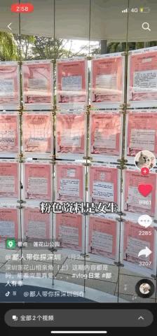 “粉色资料为女生,蓝色资料为男生,泾渭分明整齐有序。“视频中,探秘的拍摄者这样介绍深圳莲花山公园相亲角。