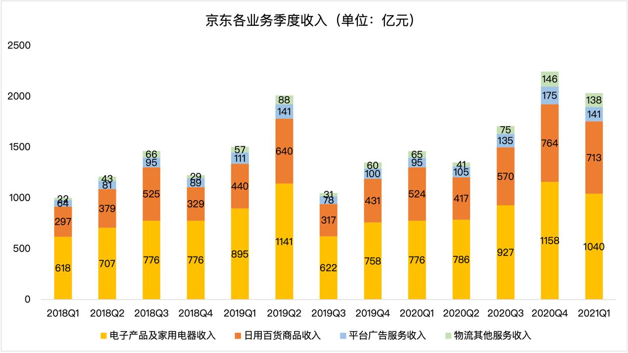 一季度来自商品收入1752亿元人民币,其中3C家电收入1040亿人民币,同比增长34%,占总收入的比重依然超过50%;日用百货收入为人民币713亿人民币,同比增长36.1%;