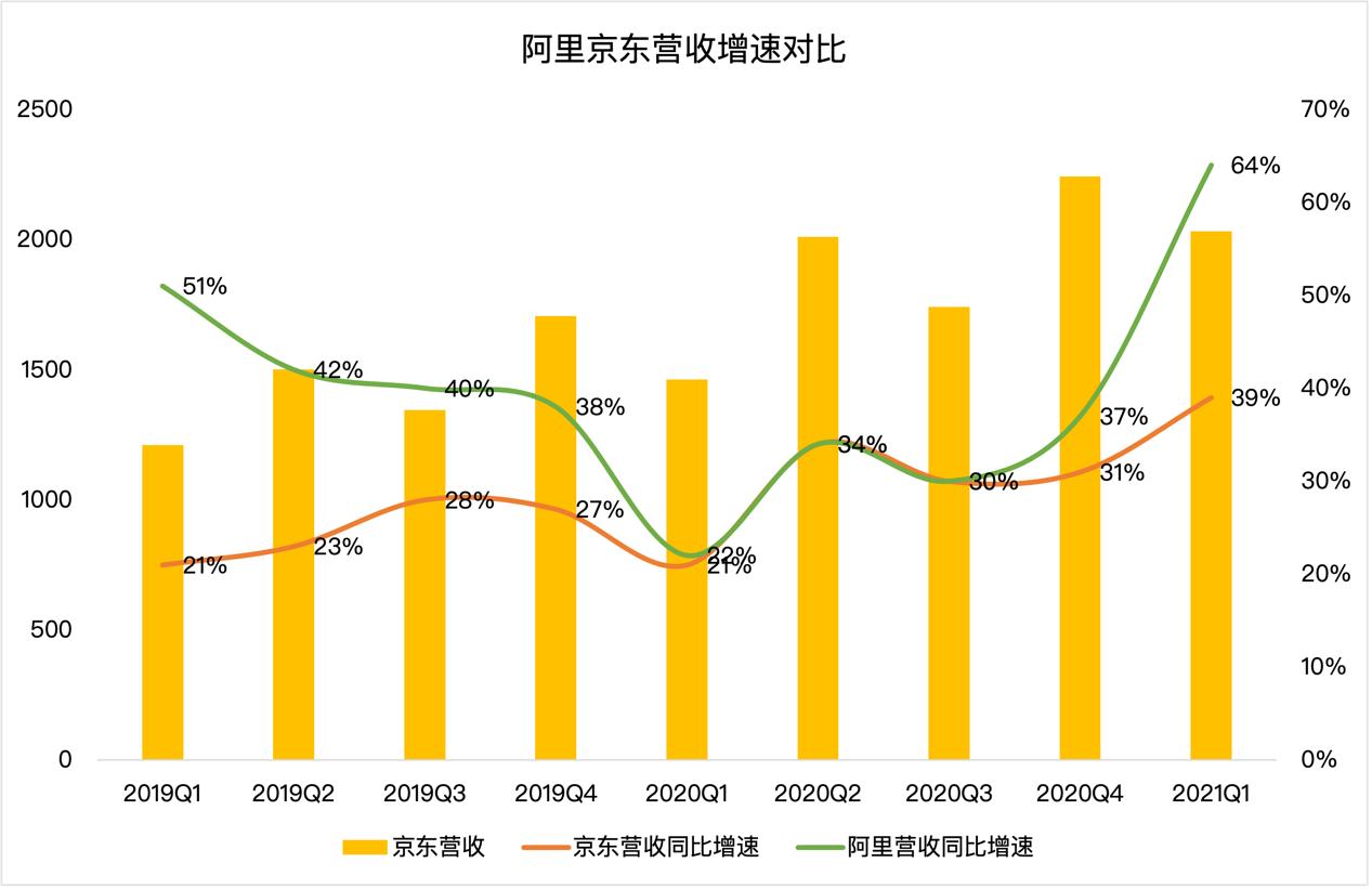 由此看来,京东39%的营收增速还是比较稳健的,阿里营收增速虽然高达64%,但主要是受到旗下的高鑫零售并表影响所致,如果扣除掉这部门业务,增速大致与京东持平。