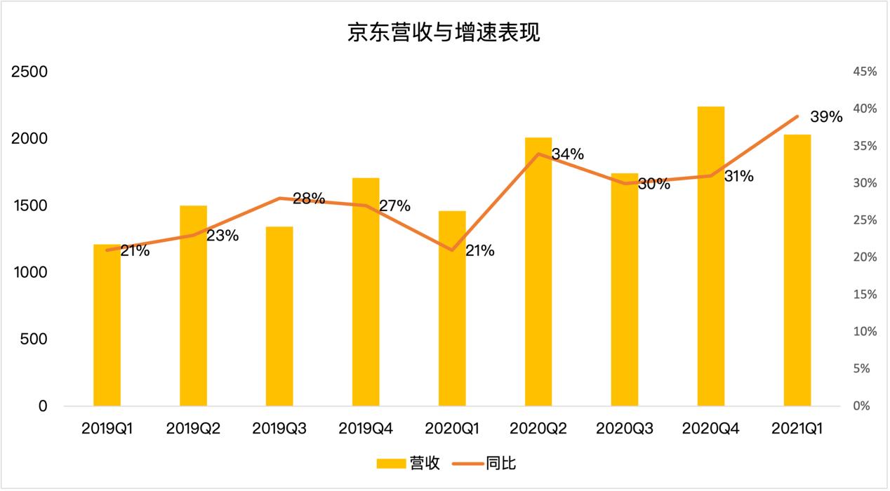 收入方面,2021年第一季度收入为人民币2,032亿元,较2020年第一季度增加39.0%,高于彭博分析师预期的1920亿元。对比上季度的31%的增速,一季度京东的营收增速相当不错的。