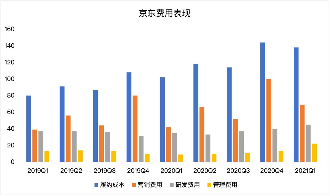 其次,来源于费用的控制,仓库储备、供应链设备建设使得物流投入自20Q4起进入扩张期,预计将延续至2021上半年,履约费用率提升自不必说,再加上2021年第一季度年货节等活动京东加大了广告投放,而去年同期京东对这部分的投入极低。
