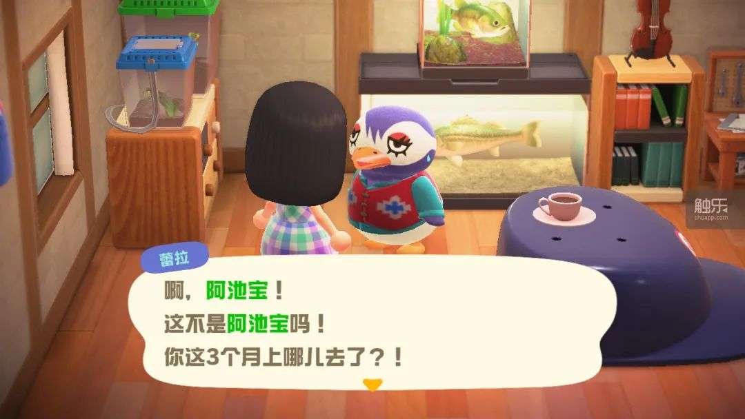 我的第一件事当然是跑去找我的小企鹅蕾拉。蕾拉家就在我的隔壁,她房间的灯是亮着的,于是我敲门走进。那是一个风格混乱的房间——因为是最初的小动物,所以她没有带“自己的房间”来,一切装潢都很朴素,摆满了我心血来潮送给她的一堆装饰物。但她的房间已经一年多没有任何变化了,连桌子都是那个巨大的丑陋的鸭舌帽造型桌,上面摆着一套非常孤寒的咖啡杯——天哪,我当时为啥送她这个?