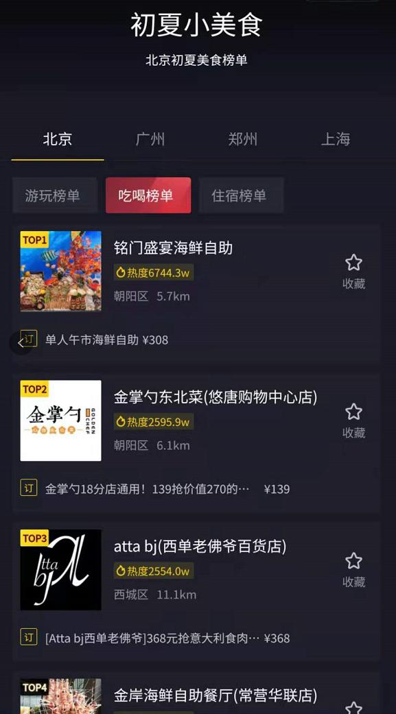 值得注意的是,小程序顶部上线了游玩榜单、吃喝榜单、住宿榜单3个模块,打开篇幅占比最大的吃喝榜单,又有类美团早期起家时的优惠团购既视感。