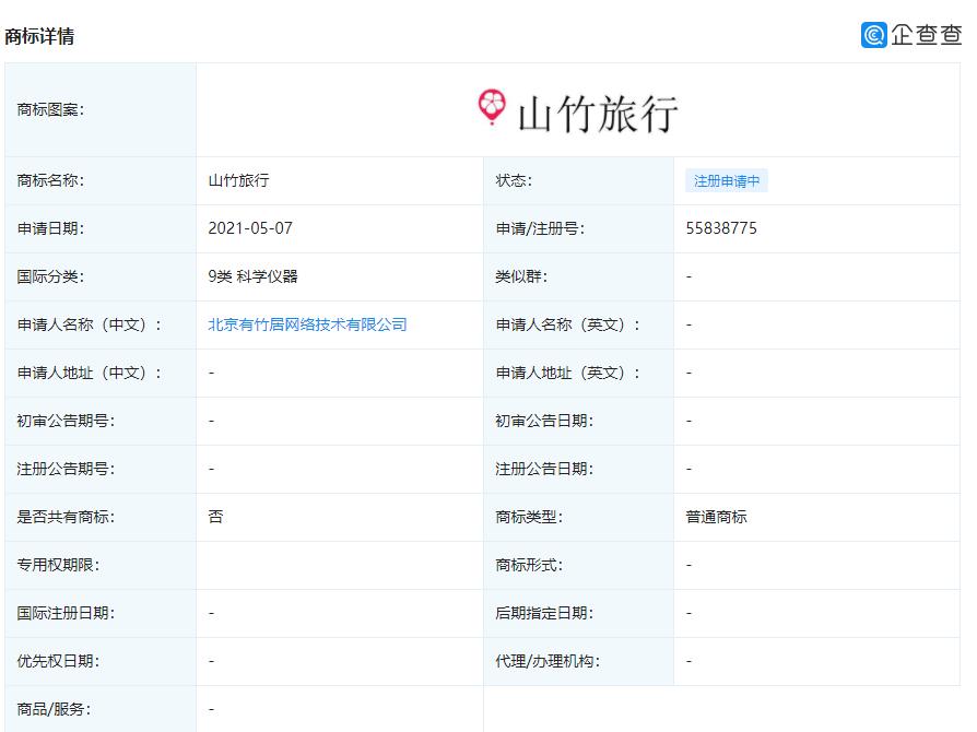 企查查亦显示,北京有竹居网络技术有限公司(字节跳动(香港)有限公司子公司)于近日申请注册“山竹旅行”商标。