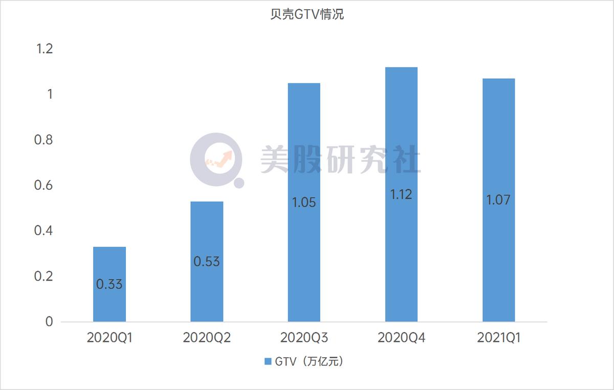 在这组数据背后,贝壳2021年Q1总交易额(GTV)约1.07万亿元,同比增长224.2%。其中,存量房交易GTV为人民币6,734亿元,占比约63%,同比增长244.2%;新房交易GTV为人民币3,434亿元,占比约32%,同比增长194.9%;新兴及其他服务GTV为人民币527亿元,占比约5%,同比增长197.3%。