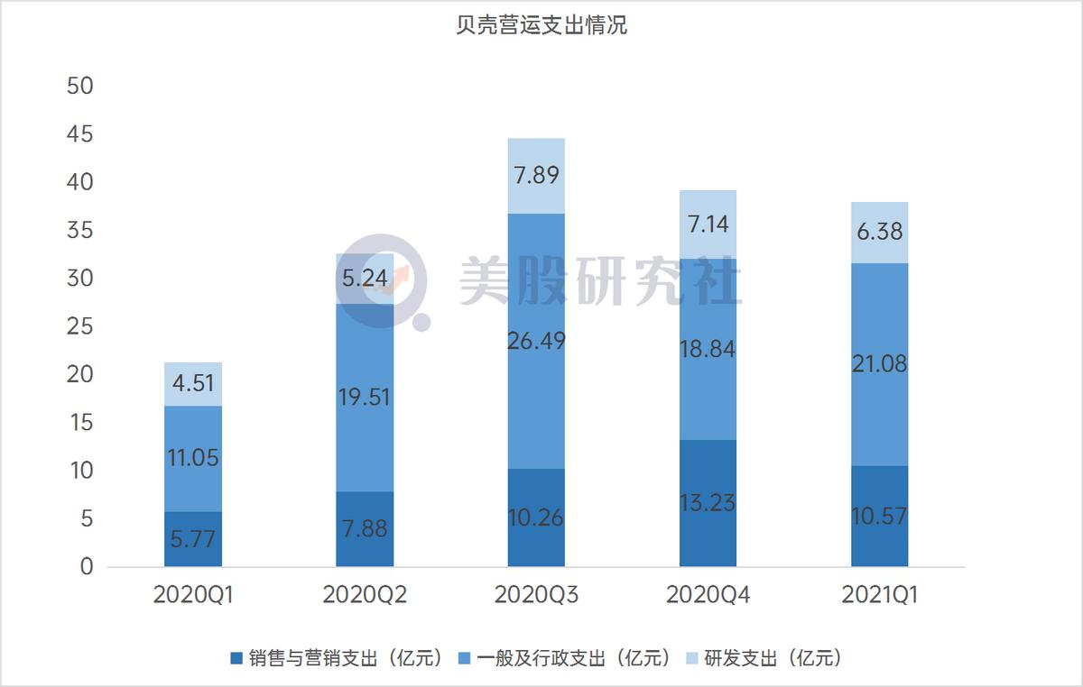 不过,表面上经纪人带来了整体业务规模的扩大、营收和利润提升,相比之下,佣金支出的增速却不容小觑,本季度佣金支出总计142亿元,去年同期为57亿元,同比增长149%。贝壳的支出结构里,线上线下的高联动度带来了大额的佣金与门店支出,又与互联网企业的拥有类似水平的带宽运维成本,导致贝壳的毛利率23.3%具有很大的提升空间。复杂的业务体系使得贝壳的管理成本也居高不下。