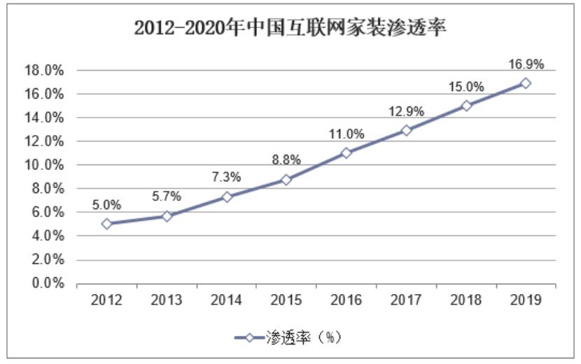 增速的放缓在消费升级与政策红利推动下,互联网家装的渗透率在不断上升。2019年家装渗透率为16.9%,同比增长1.9个百分点,而随着家居消费主力变得年轻化,选择互联网家装模式的用户还将有所提升,截止2020年底渗透率为16.9%。