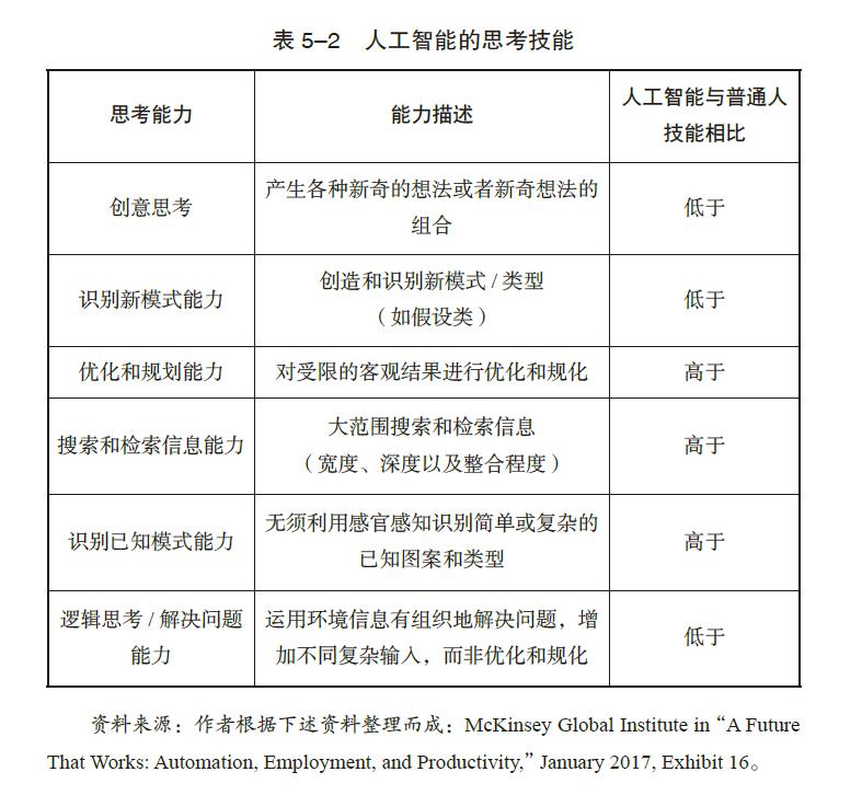 当训练数据库和计算机算力够大,白领机器人也许能完全理解我们的话语,但到目前,白领机器人的理解错误还不少,因此麦肯锡研究团队将人工智能的语言理解能力评定为“低于”普通人水平(见表 5–1)。