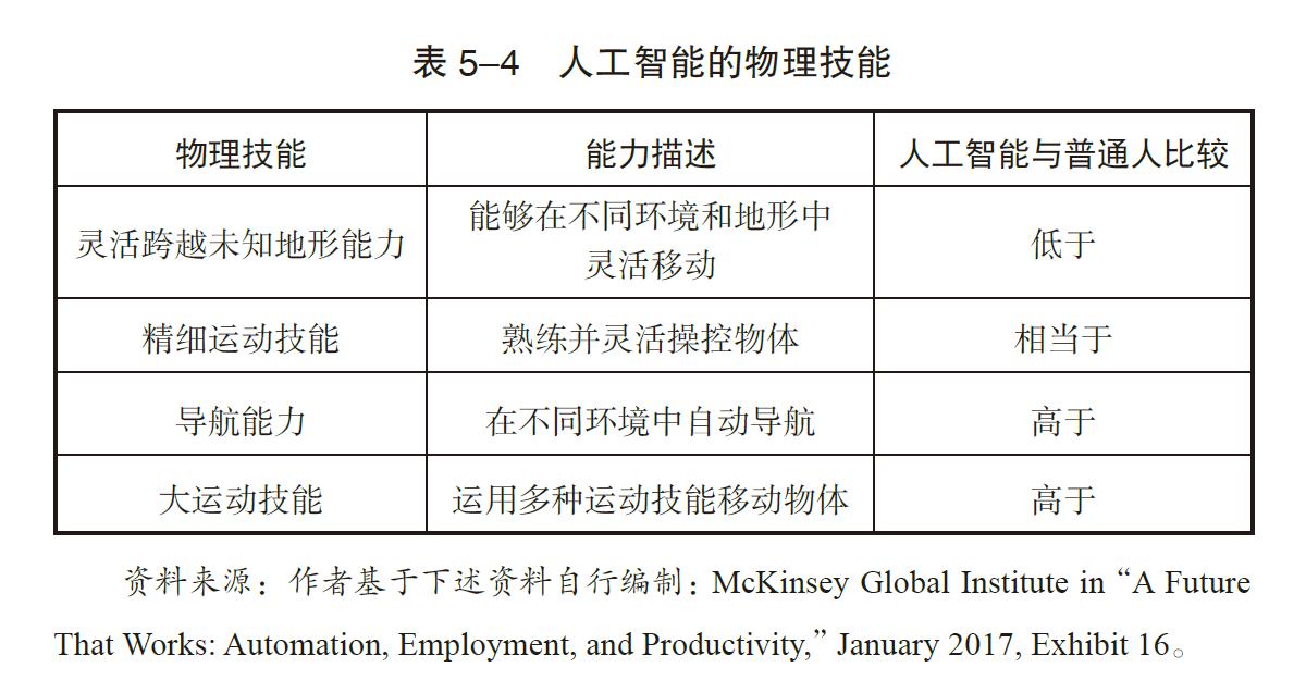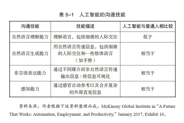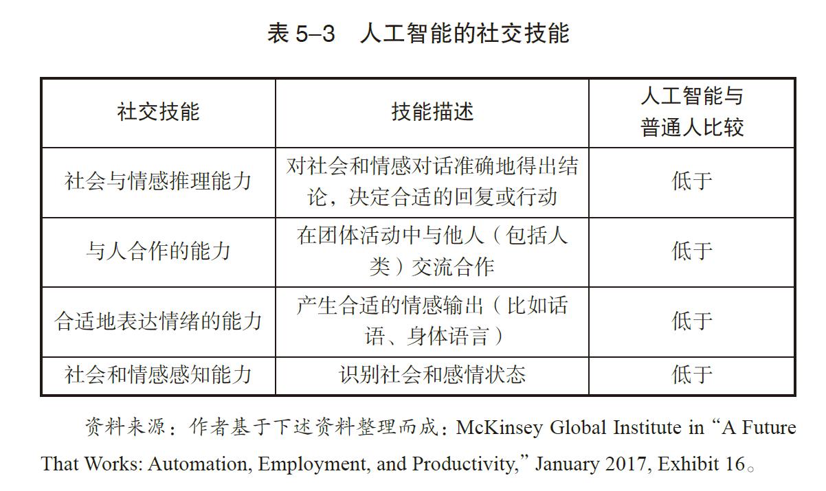 麦肯锡专家将社交技能划分为 4 种:社会与情感推理能力、与人合作的能力、合适地表达情绪的能力以及社交和情感感知能力,并将人工智能的各项得分均评定为“低于”普通人(见表 5–3)。