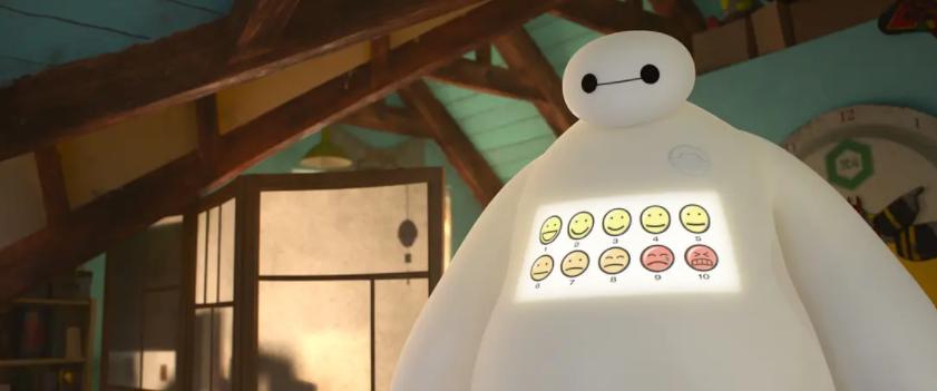 电影《超能陆战队》截图,机器人大白具备了初步的沟通、思考、社交能力,而物理技能更是远超人类