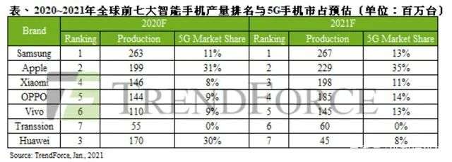 集邦咨询旗下半导体研究处发布的2021年最新的全球智能手机市场份额排名的预测报告显示,今年全球手机厂商出货量的排名将会迎来大洗牌。