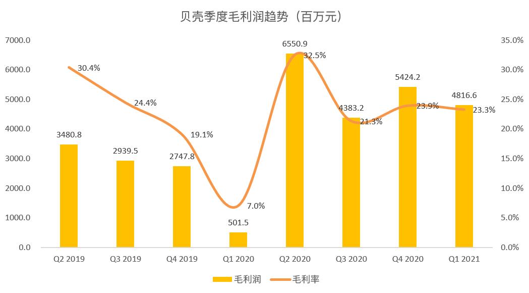 纯财务分析,判断贝壳财报表现,把握增长、毛利率、运营利润率这三个指标,即可一观。而当季表现来看,营收同比增长190.7%,乍看凶猛,恰如公司自己所言,因20年一季度新疫情整体营收基数低。同比数字失准情况下,环比数字为负8.7%,可以辅助判断。但是,不能忽视4个季度以来增速维持在57%以上骁勇状态。