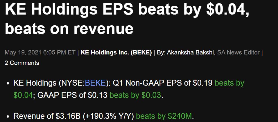 美股盘后今早,贝壳发布21年一季度财报,股价微涨1%。
