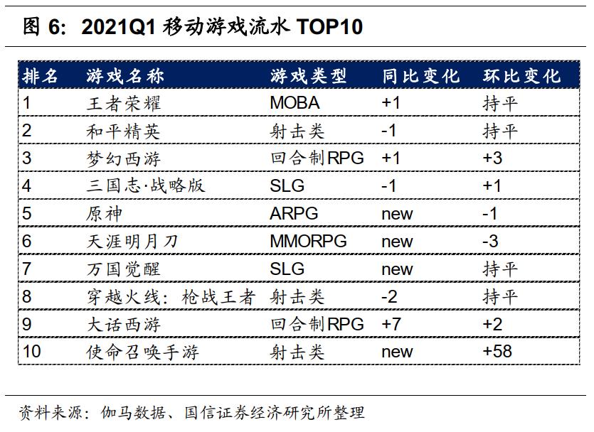 去年下半年以来,游戏行业正在崛起新势力。以《原神》开发商米哈游为代表的独立游戏公司证明了二次元游戏的生命力,而这是腾讯所不具备的。上个季度,米哈游成为了全球收入增长最快的手游厂商,与腾讯、网易包揽 12 月全球收入前三。2021Q1,《原神》仍然跻身移动游戏流水 TOP5。