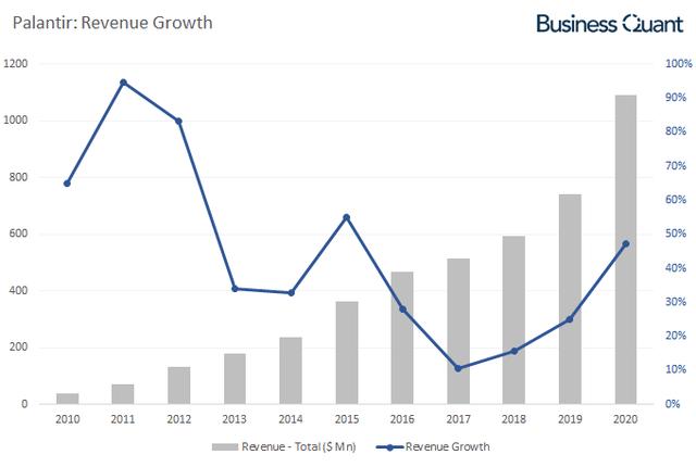 2020年突发的疫情让Palantir在感染病例分布追踪、防护物资调度、疫苗生产分销与管理等方面大显身手,公司也因此获得多项订单,上半年营收达到了4.8亿美元,同比增长48.6%。9月份,Palantir顺利上市,其股价开始快速上涨。