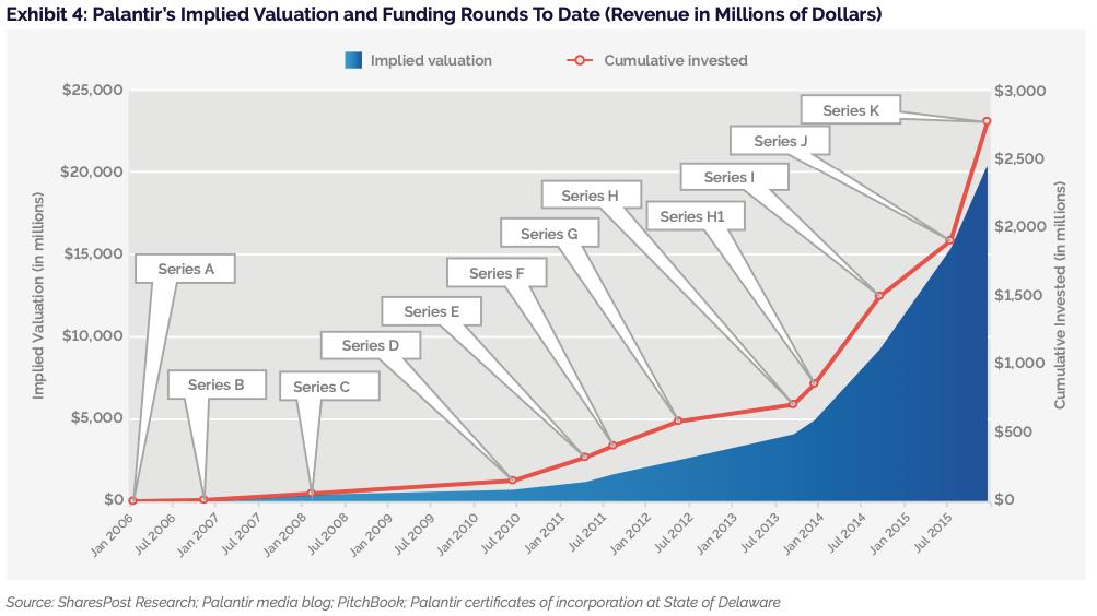 在金融领域取得成功后,Palantir逐步向能源、航空、医疗等不同行业拓展,英国石油公司、空客、德国默克医疗、好时公司等都先后成为了它们的客户。Palantir根据自身业务特点,明确优先服务超大型商业客户,这类客户普遍信息化程度高,业务流程多,数据量大,需要解决多样的复杂性问题。清晰的市场定位,一个又一个的成功案例,使Palantir在一级市场的融资估值实现了飞跃,2015年K轮融资中,其估值超过200亿美元。