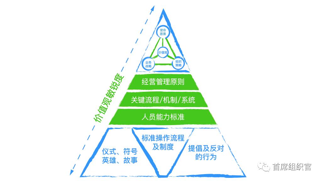 如何塑造文化?我们总结了一个简单的方法论:上中下三路法。上三路指的是使命愿景、业务战略、组织策略,以及这三者背后所体现的价值观;中三路指的是经营管理原则、关键流程/机制/系统、人员能力标准;下三路指的是仪式/符号/英雄/故事、标准操作流程及制度、提倡及反对的行为。