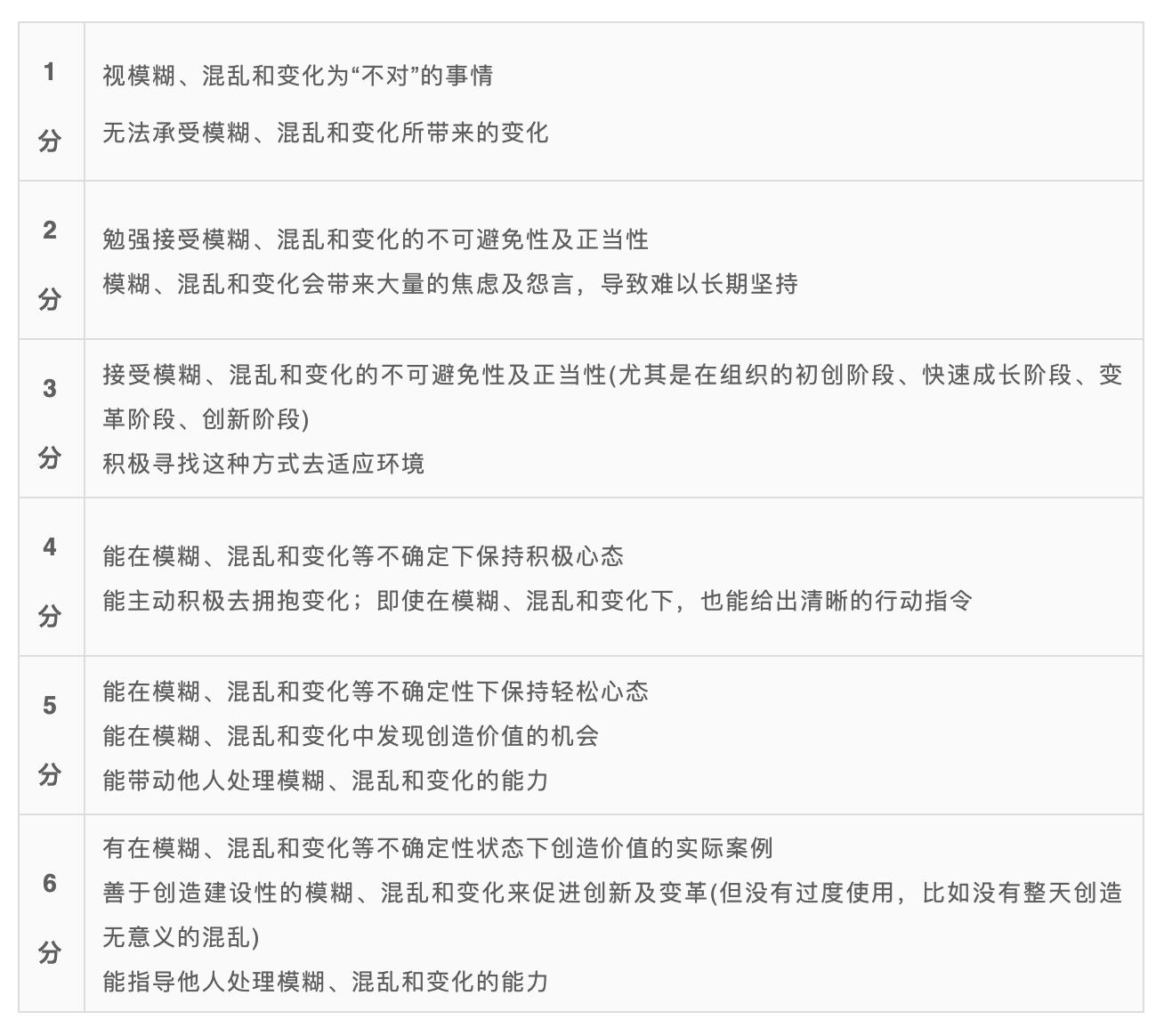 一个要求员工具备“处理模糊混乱和变化”和一个没意识到这个能力的公司,在文化气质上是非常不一样的。很多人难以理解,“处理模糊混乱和变化”是个能力吗?这真是个不常见的通用素质能力。具有类似专业技术水平的人,具不具备“处理模糊混乱和变化”的能力,在一个创业公司中的绩效会有巨大反差。这种能力不是一天两天能训练出来的,都是在长期的家庭教育、学校教育、工作经历中逐渐形成的。这种能力是创业者成功的关键。