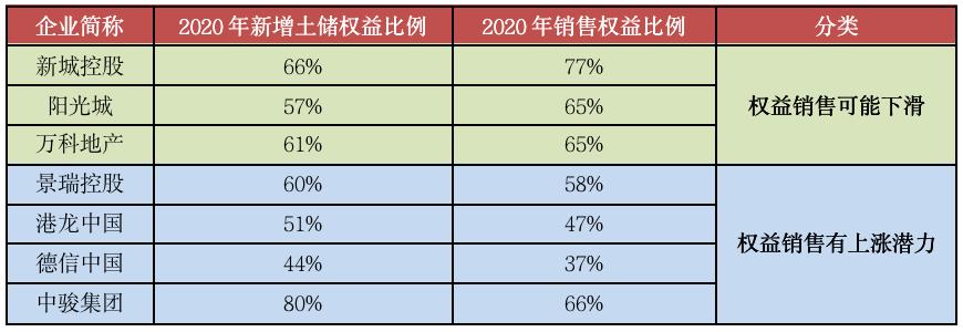 对比2020年部分典型房企的新增土储权益比例和销售权益比例来看,新城、阳光城和万科的新增土储权益比例低于销售权益比例,未来销售权益比例预期也会下调;