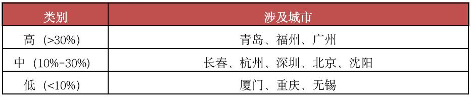 不仅如此,在对11个首批集中拍地城市测算毛利率后发现,本次土拍仅青岛、福州、广州的毛利率在30%以上,而土拍情绪高涨、地价明显上涨的无锡、重庆、厦门等城市的毛利率处于较低水平,封顶+高配建之下,无锡多宗地块大概率面临亏损。