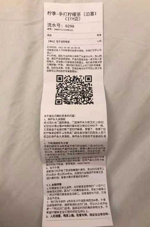 说起把小票做长,茶饮人一定会想到茶颜悦色。来看看这张茶颜悦色的超长小票: