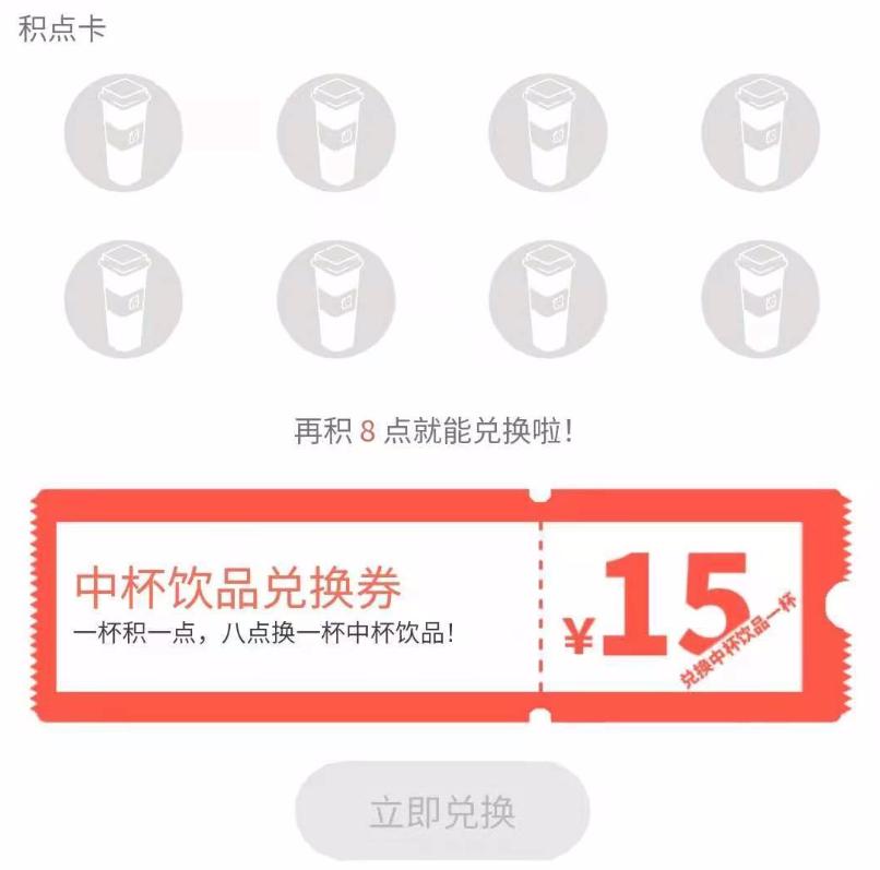 元气插座点单小程序首页就展示了积分兑换的功能,积满8点就能兑换一杯中杯饮品。