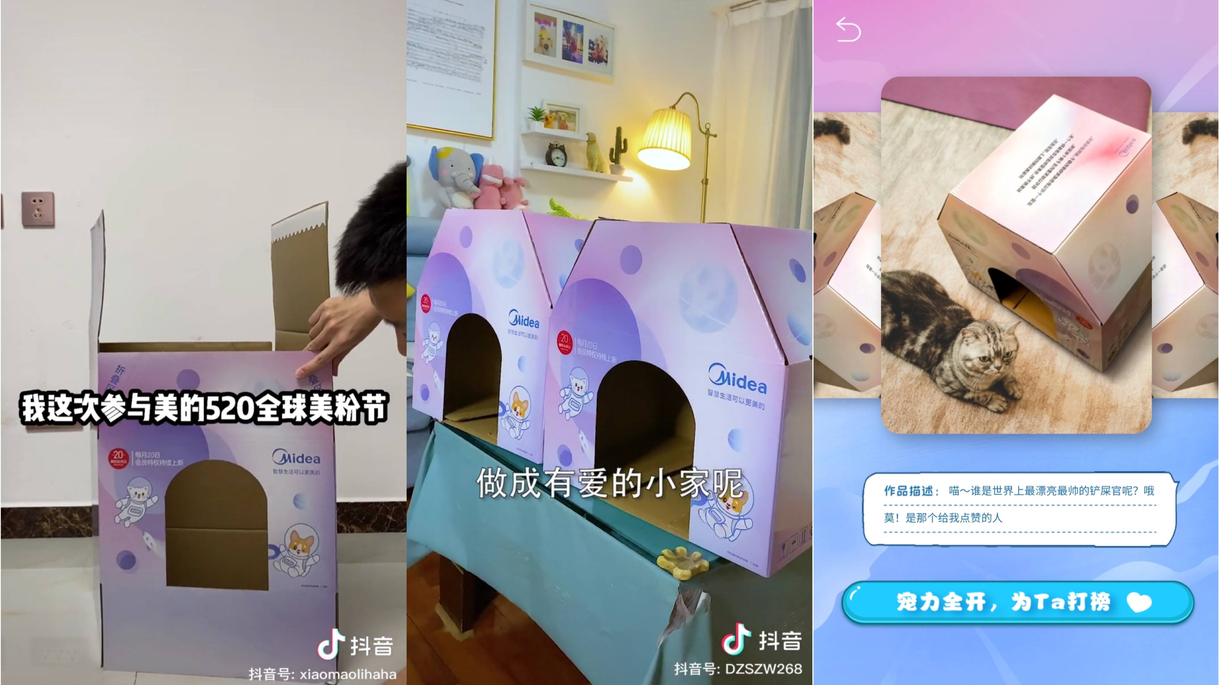 美的洞察年轻萌宠主人喜爱种草与分享,乐于接受意见领袖的原创内容输出,从兴趣爱好出发进行社交的特点,5月13日,由微博萌宠达人“回忆专用小马甲”和“大师萌宠排行榜”,小红书达人“吖来份海蛎煎”率先发布3支萌宠预热短视频,引爆话题#爱了爱了 萌动全城#。抖音达人“阿酱鸭”、“我家大鼠条”配合传播预热,发布产品种草视频,传播活动话题,营造宣传声量。与此同时,微信朋友圈信息流、美的全平台自媒体矩阵联动传播,形成传播合力。5月18日,美的发起“萌宠公益箱”挑战赛,随热销产品随机寄出萌宠屋快递箱,号召素人DIY萌宠屋。抖音达人“大壮是只汪”、“喵无敌”短视频分享公益箱制作过程;微博达人“LEO它爹”、“萌宠生活头条榜”,微信公众号“Smile生活志”,小红书达人“小豆花”等KOL图文分享公益箱制作心得。多平台KOL联动分享,引导素人制作分享萌宠的家,通过H5打榜投票,深挖每个分享者的社交圈层。